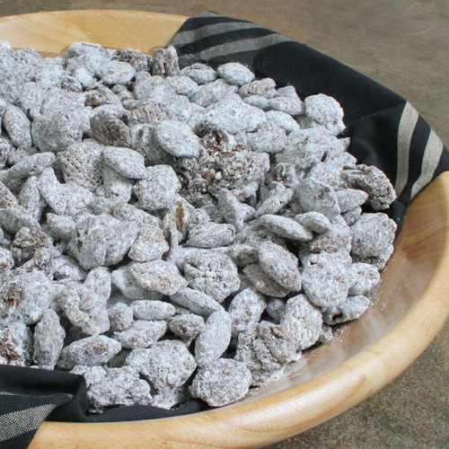 Method:Combine the peanut butter, butter, and chocolate chips in microwave safe bowl.Microwave for one minute then stir together thoroughly.Add vanilla and stir well.Place the 9 cups of cereal in a very large, separate bowl.Pour the peanut butter-chocolate mixture over the cereal and toss evenly, making sure all the cereal gets a good covering.Place the powdered sugar in a large zip-lock like plastic bag.Add the peanut butter-chocolate-cereal mixture into the bag about 3/4 full. (You may need to split up the total amount into smaller batches)Shake the bag vigorously to evenly coat each cereal piece in powdered sugar.Place in a large serving bowl and place in the refrigerator for a few hours.Enjoy the deliciousness!