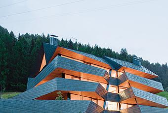 For a six-unit residential building in Italy’s northeast, architecture and design firm Plasma Studio took a decidedly contemporary approach to the regional vernacular. The color palette of existing houses in the area informed the choice of materials—blonde larch wood and dark gray pre-oxidized copper—and building codes mandated a pitched roof, but the structure boasts a highly geometric form (the firm’s signature move), courtesy of balconies that jut from the facade, echoing the roof’s slope. In profile, the domicile has the prototypical gable, but from all other angles it takes on the look of abstracted folding planes that express the steep site, says architect Ulla Hell of Plasma Studio.
