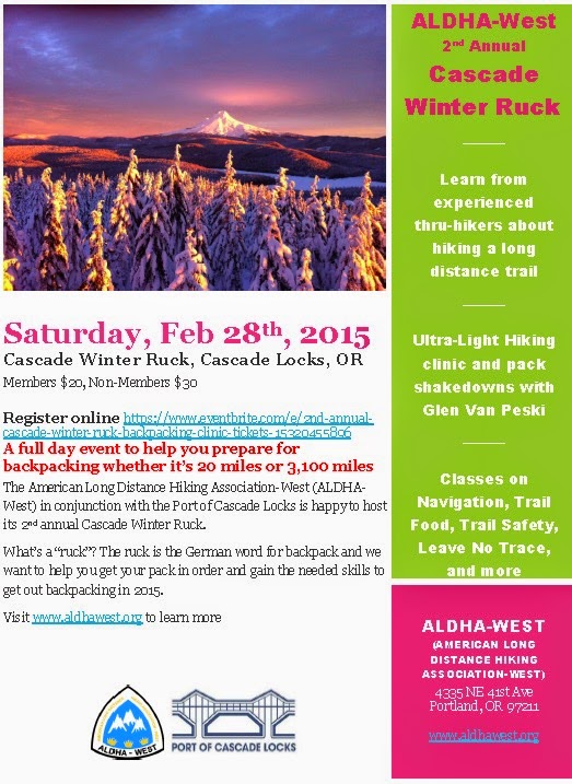 ALDHA-West Winter Ruck (Backpacking Clinic)ALDHA-West (American Long Distance Hiking Association West) is doing their second annual Cascade Winter Ruck on February 28th in Cascade Locks. A full day of presentations and seminars on all aspects of backpacking. This isn't just for thru hiking hopefuls, but also for anyone interested in doing multi-day trips. I will not be there the full day, but I will be giving the final presentation of the day on my overall triple crown journey. Register here to attend!