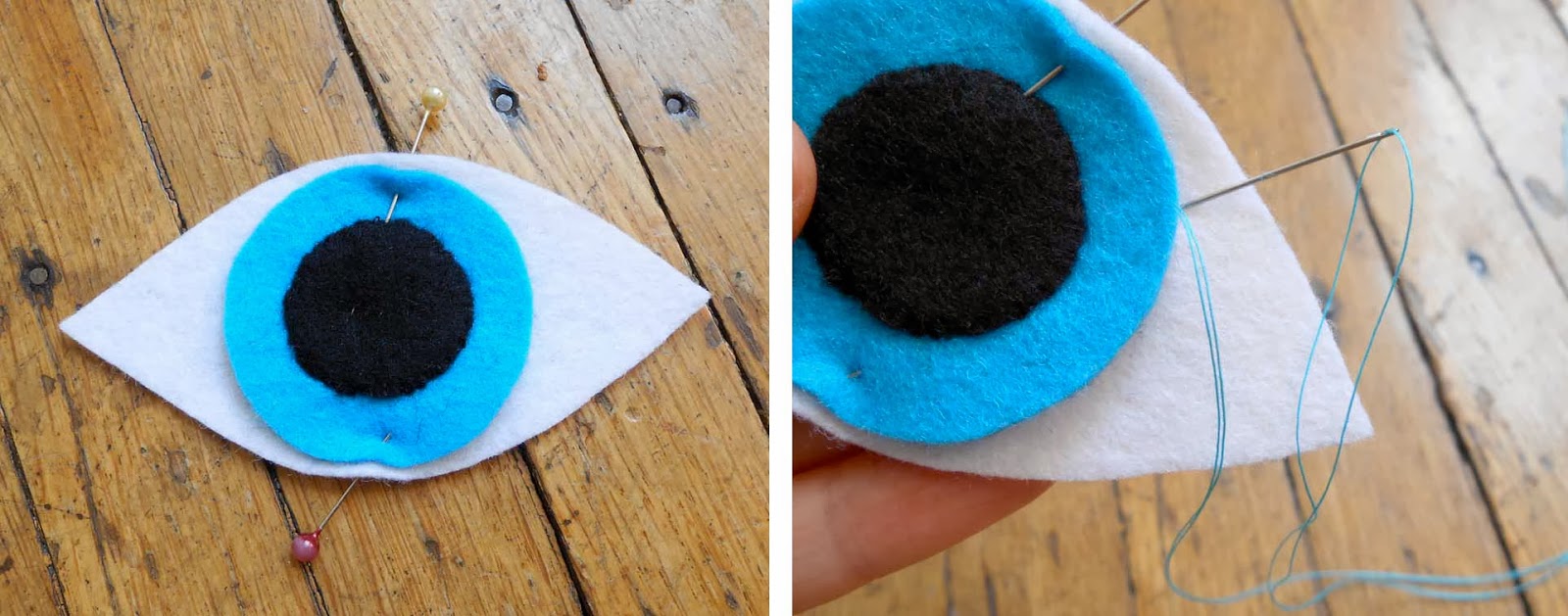 Step 7: Starting in the corner, push up from the bottom of the white felt with your needle and begin a simple running stitch around the perimeter of the eye.