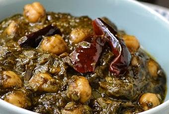 This curry tastes sour because both the greens being used are inherently sour. The sourness is balanced with the spiciness of the red chilies and the pungency of the garlic. Either chickpeas or soaked and cooked chana dal can be used.