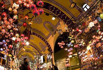 The Grand Bazaar in Istanbul is one of the largest covered markets in the world with 60 streets and 5,000 shops, and attracts between 250,000 and 400,000 visitors daily. It is well known for its jewelry, hand-painted ceramics, carpets, embroideries, spices and antique shops.