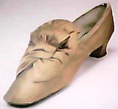 Mustard silk court shoe with Fenelon bows inspired by the 17th-century baroque style, from England, circa 1880.