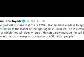 ”The greatest mistake that the ECOWAS leaders have made is to appoint @MBuhari as the leader of the fight against Covid 19. This is a cataclysmic error which they will deeply regret. He can barely manage himself & now you ask him to manage a sub-region of 400 million people?” he wrote on Twitter