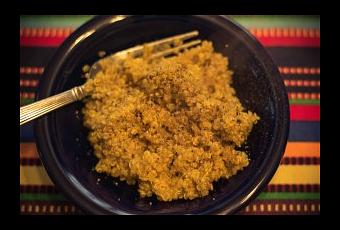 Month #2 of Taste and Create and I was partnered with TinkuShaji, an engineer, new Mom & cook. I had a blast browsing her site and looking at all the Indian flavors. I could almost smell the curry, chutneys and appetizers. My one challenge? Finding a lot of the ingredients to make her great dishes. So I compromised! I picked a recipe for Sev (a crunchy noodle like dish) and turned it into a delicious quinoa side. With hints of lemon, turmeric and curry and a beautiful bright yellow color.