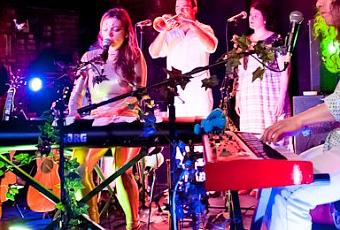 Arc Iris’ music spoke volumes to the tightly packed crowd at their NYC album release show at Mercury Lounge last night — the whimsical, visceral and raw songs drawing huge appeal. The auteur, Jocie Adams, former core member of renowned indie-folk band The Low Anthem, moved fluidly from vocals to piano to clarinet to guitar, all while leading the 8-piece ensemble through complex and lengthy songs. Dressed in a gold spandex bodysuit, the rest of the band in various sequined and colorful accents, Adams seemed to lose herself completely in the music, while remaining entirely hyper-connected to the full ensemble. Indeed, nearly every musician on stage played a few different instruments throughout the concert, and the broad sweeping musical arcs lent themselves well to spontaneous innovation.