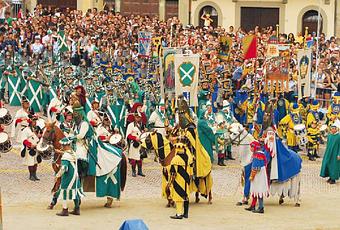 The Joust of the Saracen (Giostra del Saracino) is a famous medieval costume festival held twice a year in Arezzo, Tuscany. The Giostra del Saracino as it is known among the aretini (inhabitants of Arezzo), is the event that represents at its most the traditions and the history of Arezzo. The Saracen Joust is a historical event with very antique origins: 13th Century documents show how Aretins were fond of jousts and tournaments and the joust was certainly carried out in 1400. Master of Ceremonies of the Saracen Joust in Arezzo. The most ancient document, however, is a Priors' resolution stating that the Joust against the Saracen should take place on Sunday and that the prize would be a piece of purple satin. The whole city turns up in medieval costume to recreate the atmosphere of medieval Arezzo as the quarters of the city compete against each other in a joust to win the Golden Lance. Today, there are 8 knights for the 4 quarters of the city - Porta del Foro, San Andrea, Porta Santo Spirito and Porta Crucifera. Each knight gallops on horseback with a wooden lance and aims at the Buratto and its shield. The Burattto is an armor-plated dummy holding a shield that is divided into sectors corresponding to points. The knight has two runs along the lizza (jousting track) that runs obliquely in Piazza Grande, and is won by the Quarter whose knights obtained the most points. The jousting day starts in the morning, when the town's Herald reads the proclamation of the joust challenge, and then continues with a colorful procession of 350 costumed individuals and 27 horses parading along the streets of Arezzo. The high point of the parade is the blessing of the men-at-arms, which takes place on the steps of the Duomo and is carried out by the Bishop of Arezzo. The joust takes place twice a year on the penultimate Saturday in June and first Sunday in September, with related events on the days around these dates. If you're in the area at the time, try not to miss this festival. Tickets are required for the actual joust but of course not for the processions.