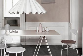 Reminiscent of a twirling skirt, the Dancing Pendant Light by Iskos-Berlin for Menu is a playful twist on sartorial details. Its oversized proportions make for an intimate setting or focal point in the dining room. The pleated, pyramidal shade is also made of polyester felt, which also absorbs sound.