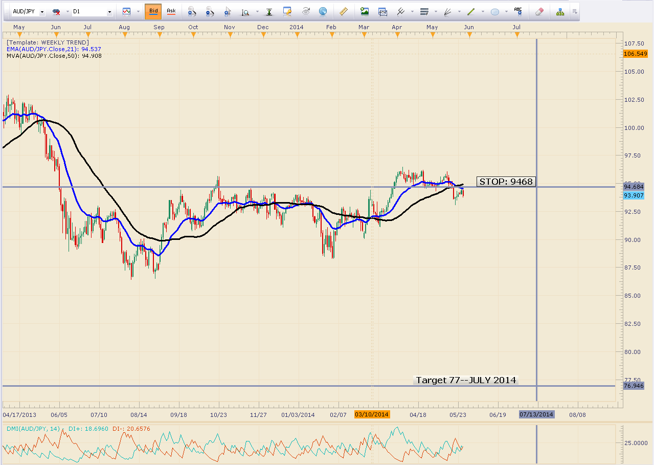 I was monkeying around with USDJPY this morning per Twitter. I spent some time with the weekly and daily charts. AUDJPY appears the clearer play for me.