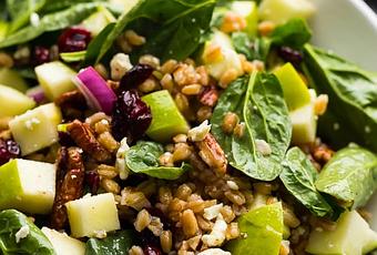 This autumn apple farro salad contains crunchy Granny Smith apples, pecans, dried cranberries, feta cheese, farro and spinach, all tossed in a tangy vinaigrette. The perfect way to celebrate apple season!