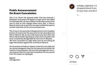 "This is to inform the general public that the planned 1st anniversary of Option Lounge which was billed to hold on 5th January 2022, and the after-party which was to hold at club voltage where Ayra Starr, a Mavin Records artist was to perform has been shifted forward to another date that will be communicated soon.