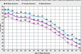 That means the Baby Boomers are now starting to reach retirement age -- with 61% of the 65 year olds, 66% of the 67 year olds, and 68% of the 68 year olds already out of the work force. Right-wing Republicans have been trying to scare Americans for several years now by talking about the size of the Baby Boomer generation (which admittedly is large), and claiming that this generation will "bankrupt" the Social Security system. Their hope is to create enough fear among younger Americans to let them damage Social Security by cutting benefits and raising the retirement age.