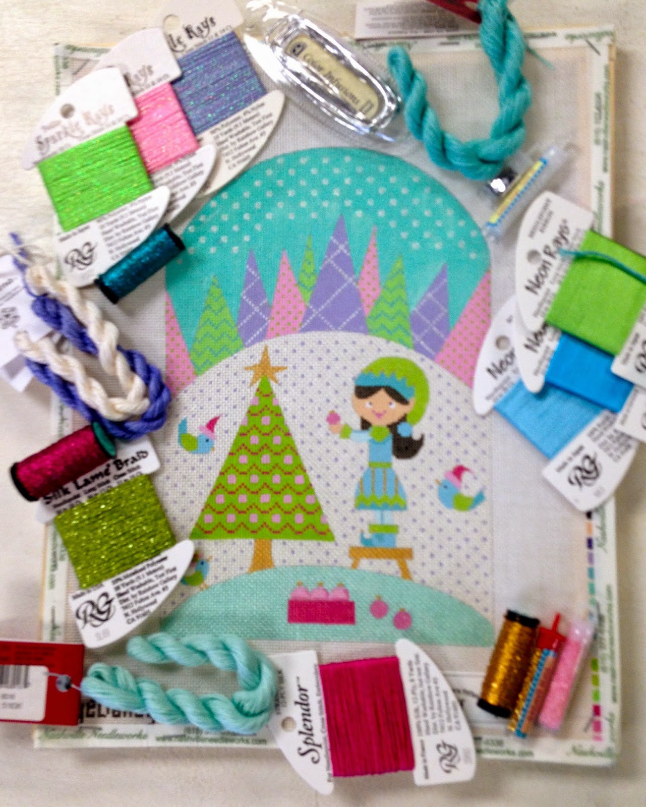 They hosted my trunk show as well as myself and it seemed to me that my canvases were flying out the door, woo-hoo! And it didn't hurt that Connie Camp was on hand to pick threads and stitches either-- here is the kit she pulled for my "Trimming the Tree" canvas: