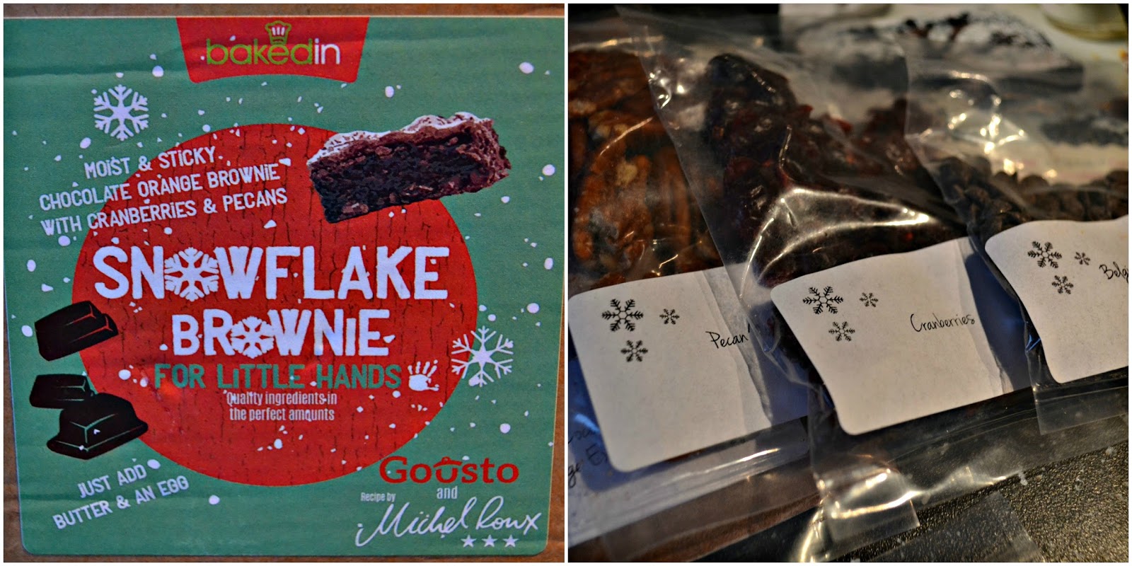 The recipe for the brownie was created by two star Michelin chef, Michel Roux and contains a simple kit with each ingredient weighed out into a little bag. The only additional items the snowflake brownies requires is an egg and 60g of butter, it even comes with it's own disposable baking tray and grease proof paper. It's such a great idea and meant my stress levels were dramatically reduced!
