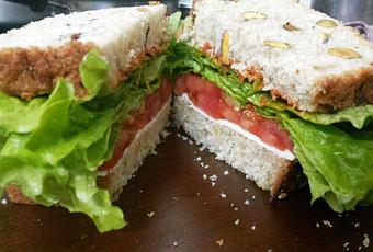 Bread and butter is the ultimate comfort food in my home. I just turn around and contaminate it and make it healthy. No sir, we don't serve white bread here...This sandwich was breakfast. Lettuce and tomatoes are from the backyard. The cheese and butter and schezwan sauce is from a bottle...And the pista/pistachios are baked in the bread.