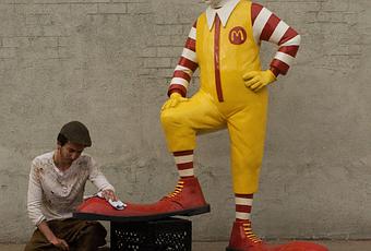 The audio guide: “Shoeshine, depicts “the powerful figure of Ronald McDonald waving impassively as his ridiculously oversized clown shoes are buffed to a fine shine.”