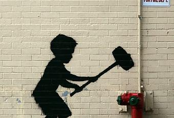 Fresh update from the 20th day in the “Better Out Than In” series in New York from Banksy. The stencil is a of a young boy taking a hammer to a fire hydrant, apparently located within Upper West Side.
