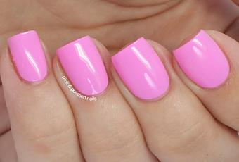 Bright bleached neon bubblegum pink creme. Formula was super smooth and swatches are three thin coats with top coat.