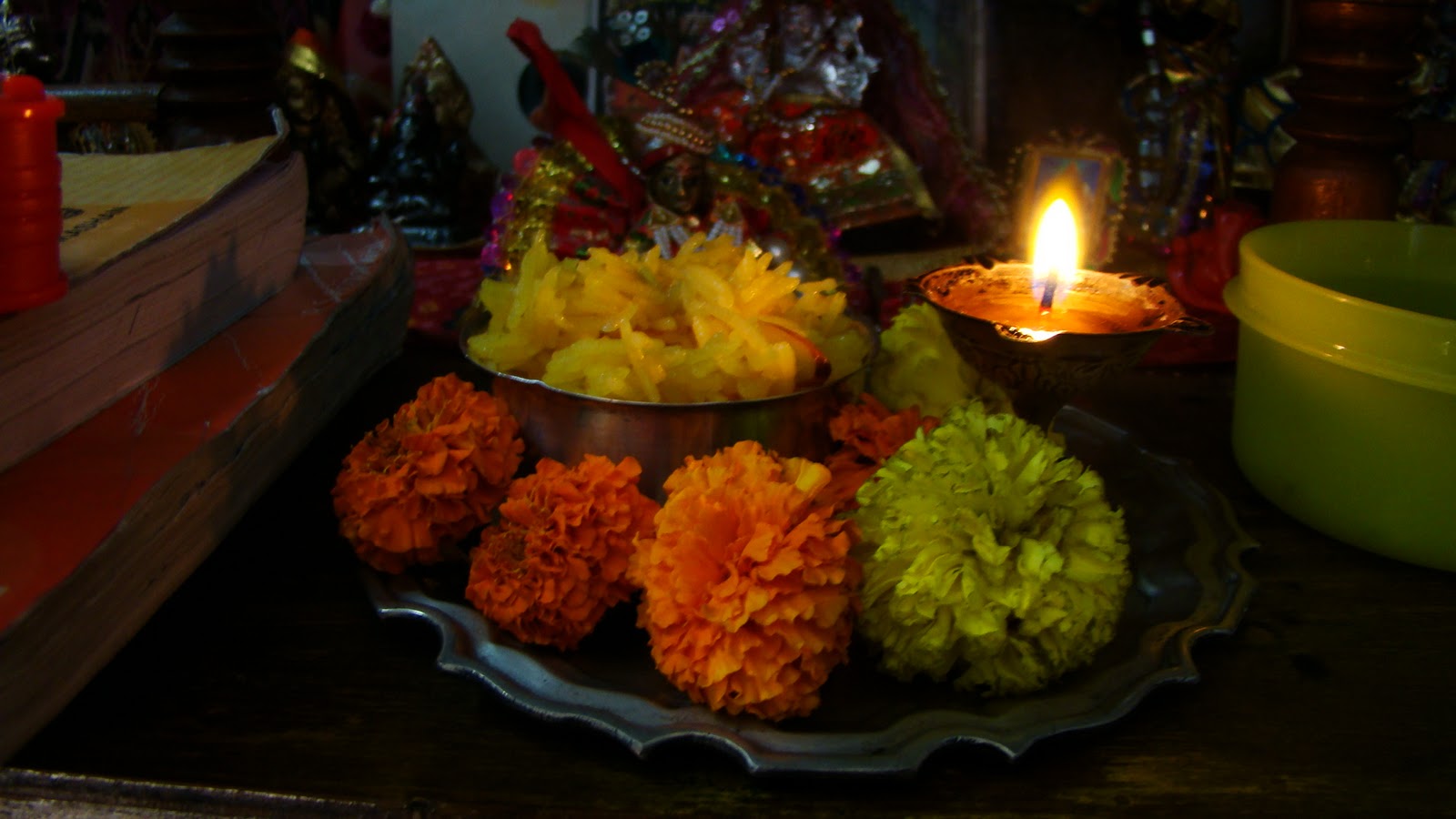 By the way..thats baby Krishna or Laddoo Gopal looking on at the rice offerings! The books and the pencil case...bless our knowledge and our writing...so the pen drive is also there with the pens.
