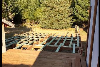 Heavy rain last Thursday and Friday slowed us down, but we were still able to get the foundation for the cottage finished by dinnertime Saturday, at which point I took this picture. We had already done all of the joists on Thursday before the rain started in earnest, then on Saturday I got all the green foundation boards in place. It was mostly a one-person job, so while I worked Chekhov started staging all the parts for the second cottage nearby (just out of the frame to the left). Meanwhile, Grace was taking measurements and making calculations for the roof, which we plan to start in the next couple of weeks. On Sunday we got started on the lower part of the cottage walls, and this time I decided to do the porch as part of the first day of work so we’d have a place to stand instead of having to put down boards and plywood to stand upon. Then all this week we worked on the cottage with the help of my usual hired man and a friend of his; the wages for the second helper were provided by a generous donation from one of my gentlemen. I really want to get the roof in place before the rainy season really gets going in the autumn, so the gift of funds for the second helper were very much appreciated; next week you’ll see the results!