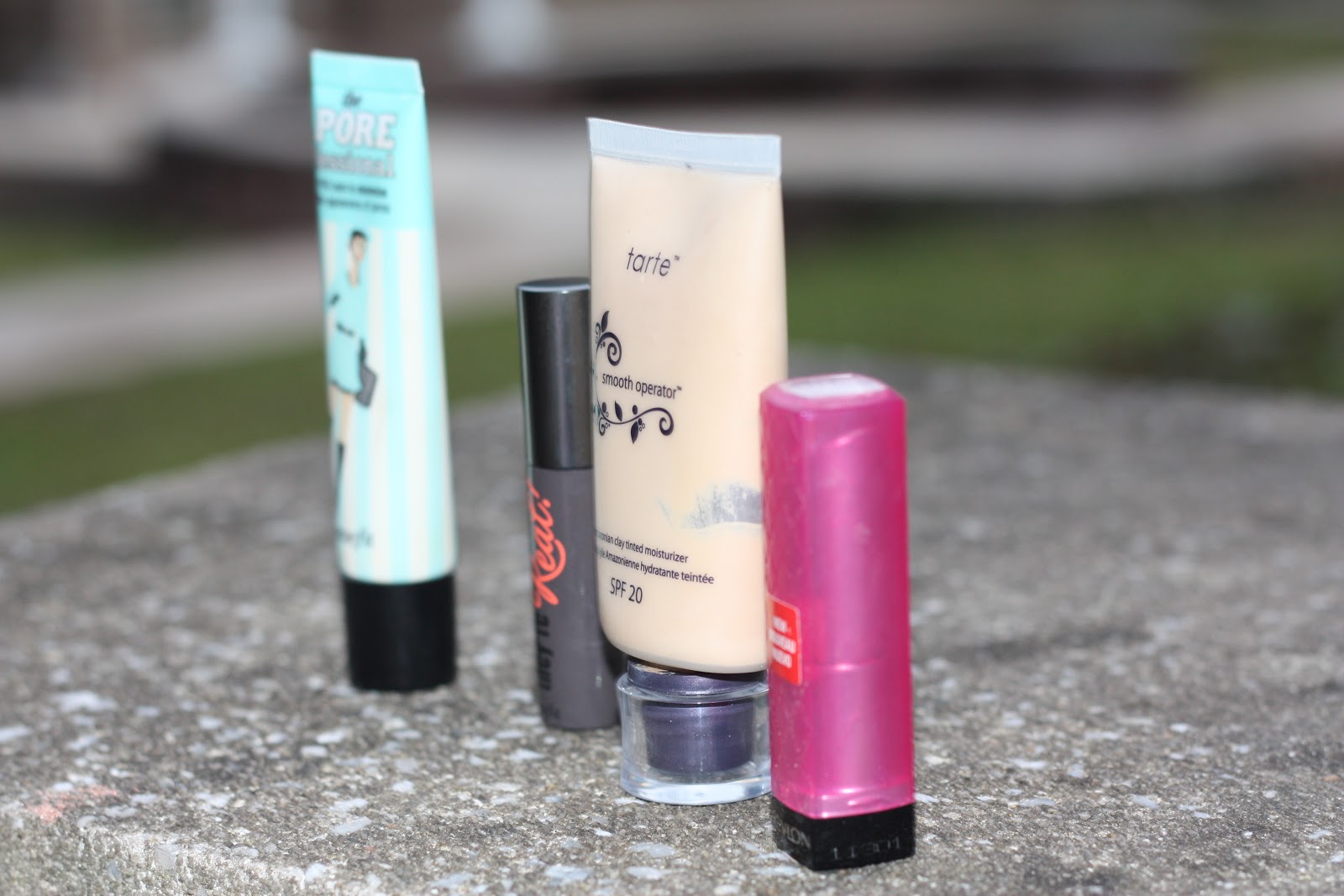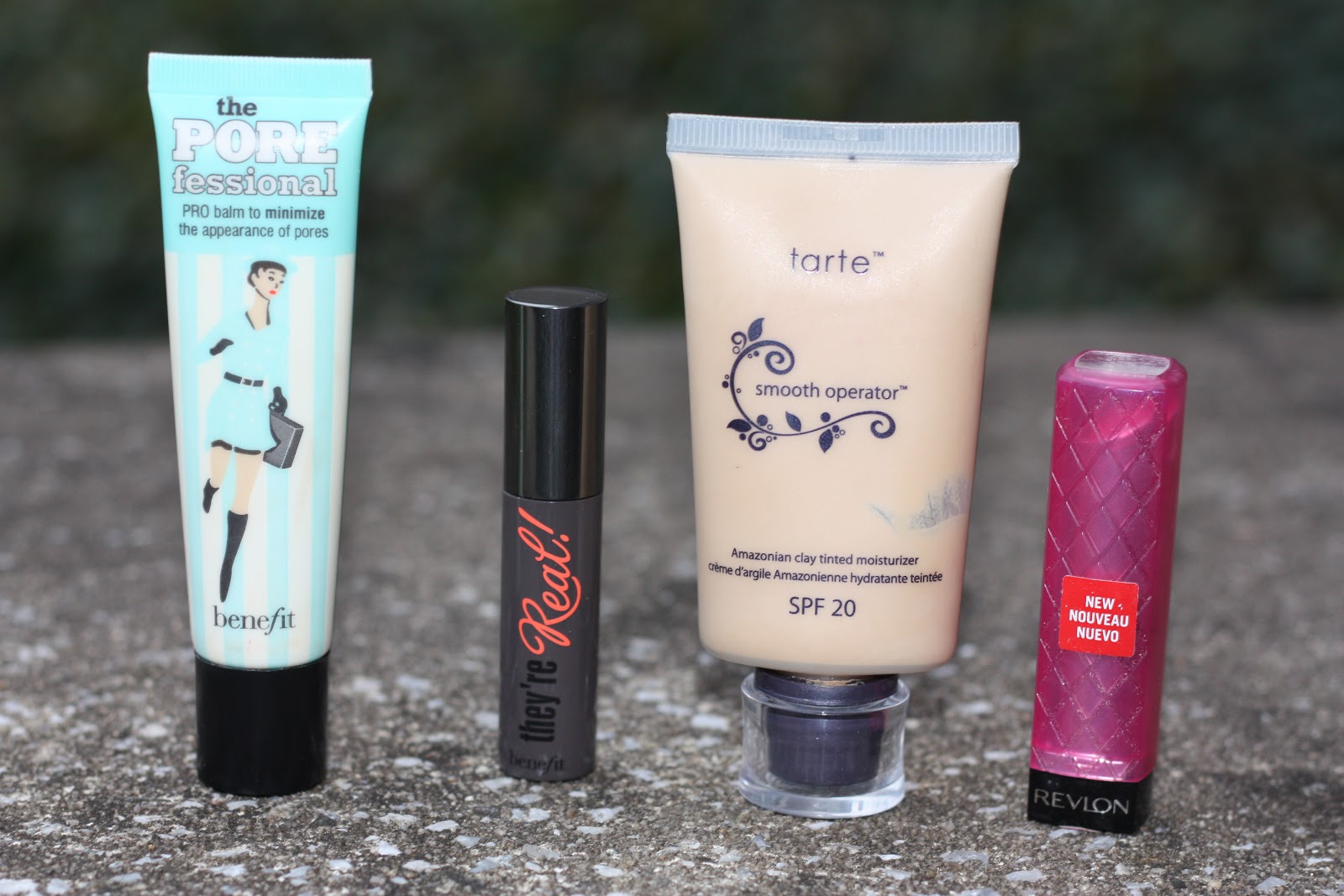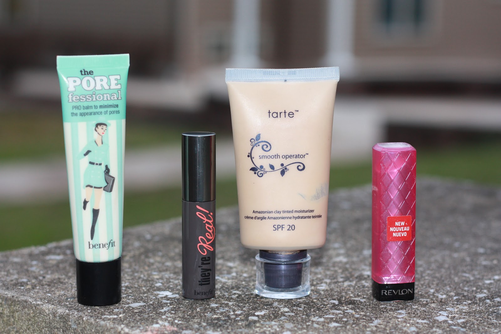 1. Benefit Pore-fessional: This product is somewhat my holy-grail product. It is a tan paste which you place on your forehead and eye area which instantly "erases" your over exposed pores. Not only is it a pore minimizer, but also a great primer in general for face makeup. 2. Benefit's They're Real: This mascara is an instant eyelash lifter. I had seen people raving about it quite often, but figured it wasn't worth the hype. However, I recently purchased a set from Benefit, which included the traveled size; I am hooked. It isn't a mascara where no matter what you do, it will always look minimal or clumpy. The way you apply it is how it ends up looking, which gives the user more control which is quite convenient. 3. Tarte Smooth Operator: In the winter months my skin tends to get very dry and flaky. Face makeup looks like it is falling off my face in flake form. To combat the dry winter months while still minting "flawless" skin I use this product. This tinted-moisturizer is very moisturizing and glides onto your skin very easily while still having great coverage. 4. Revlon Lip Butter in Loli-pop: Instead of wearing lipstick or plain old chap-stick, I tend to wear a Revlon Lip Butter. They are a mix between lipstick and chap-stick, creating a wonderful blend of color and moisture. This color in particular is great for winter because it is not a typical summer pink shade and it is also not a vamp deep red. I like to call it my happy medium shade. Whether you like this shade or not, I would in general recommend trying out this product. Some of my other favorite shades include: Strawberry Shortcake, Candy Apple, and Raspberry Pie. Something you didn't get to see........
