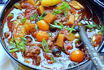 Blend in the olives, spicy tomato juice, salt, and chili flakes and cook on medium low another about 45 minutes~~add water as needed and stir occasionally so nothing sticks to the bottom of the pot. Add the potatoes/blend into the mix, lower the heat to low and cook another 30-45 minutes. Stir several times. If not serving immediately, turn off heat and move to another blaze.