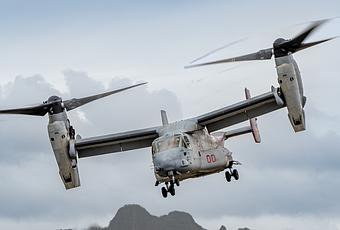A MV-22 Osprey hovers during their flight demonstration during the 2025 Kaneohe Bay Airshow. Note the water vapor forming at the proprotor tips, condensing out of the air due to rapid changes in pressure and temperature. The Osprey’s large proprotors spin at very high speeds, especially in helicopter mode. This generates extremely strong tip vortices, making the vapor trails highly visible in humid conditions. The MV-22 is primarily operated by the United States Marine Corps, where it serves as a medium-lift assault support aircraft capable of transporting 24 combat-equipped troops. First flown in 1989, the Osprey entered service with the USMC in 2007 and the USAF in 2009.