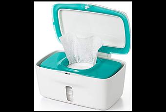 In addition to wipe warmers, we decided to include a middle option on this list. The OXO Tot Perfect Pull Wipes Dispenser does not warm wipes, but it does provide a strong seal to keep wipes moist longer. This wipes dispenser is made from BPA free, phthalate free and PVC free plastic. It features an easy, one-handed use click-open lid, simply press until you hear a click and the hinge slowly swings open. When finished, press the lid back down until you hear the latch click. There is a soft, silicone gasket all around the inside of the lid to create a tight, moisture locking seal. The wipes sit underneath a weighted plate, which helps dispense just one wipe at a time. The non-slip feet on the bottom of the dispenser keeps the box from sliding around during diaper changes, and like many of the warmers on this list, there is a clear window on the front to indicate when wipes are low. This dispenser comes in just under the lower warmer prices at about $20.00, and it easily accommodates up to 100 wipes. While most agreed that the price point was higher than we would expect for a non-warming wipe dispenser, parents in our test group were genuinely impressed by the sturdiness of this model, noting both its compact size like the GoGo Pure Warmer and also its weight (notably heavier than some warmers like the Munchkin Warm Glow) to keep the dispenser in place during use. Overall, we are happy with this as an alternative for parents just looking to maintain moisture and freshness in their wipes.