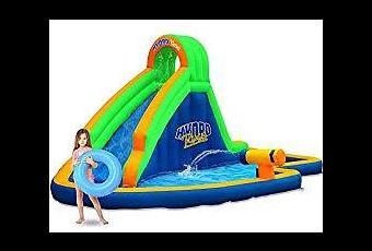 It's not really a bounce house, but it is giant and inflatable, and definitely just as fun. It's also quite expensive, coming in at around $480, but it is also certainly the most substantial one on the list. This is basically like having a miniature water park in your own backyard, with a huge and awesome inflatable water slide, kiddie pool at the bottom, and a large water cannon you can hook up to your garden hose. This thing has it all. Hook up your garden hose and it will get the water cannon spraying as well as a top sprinkler to keep the slide wet and running smoothly. When we filled it up, we simply hooked up the hose and let it do its trick for about an hour. This was an awesome way to do it because it filled somewhat slowly which helped warm the water in the sun as it streamed down the slide. It is quite big and has a capacity of 6 kids, ages 3 and up. The steps to get up to the top of the slide have little holes to stick feet in as well as cloth hand-holds to pull yourself up. Surprisingly sturdy and well-built, and the slide has good sized walls on it to keep kids safe and going in the right direction. And it inflates in about 2 minutes, and deflates and rolls up in about 5 minutes. Our kids absolutely loved this thing, and they beg for us to take it out and inflate it on every warm summer day! Interested? You can check out the Blast Zone Hydro Rush here!