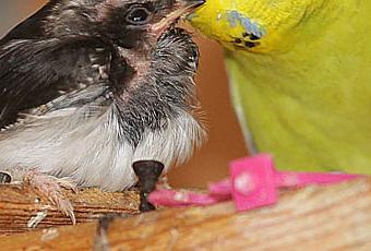 Susie the budgie cares for swallow baby Max in Thale, Harz, Saxony-Anhalt, Germany. Max the tiny swallow tumbled from the nest. Animal trainer Jens Rennecke spotted the tiny bundle of feathers and took the baby bird home with him. Max found an attentive adoptive mother in the form of eight-year-old budgie Susie