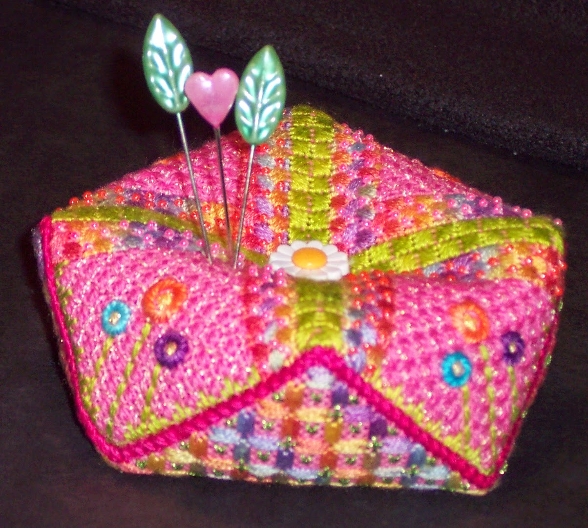 You might recall my series of needlework accessories that were published in Needlepoint Now, the Spring Garden Biscornu, Humbug and Floss Tag. Here's the biscornu: