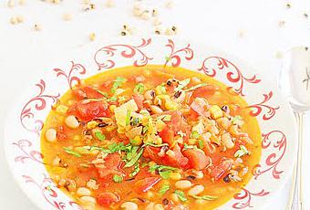 Black-eyed pea and red pepper soup is an easy to make one. You start by boiling the peas, mine took about 2 hours, until the peas are soft but still hold their shape. In a pan you saute the onion, adding the celery and belle pepper to it when it's translucent. Cook a little bit more until the veggies start to soften. Add then some tomatoes and corn. In the end add the peas and cook until all the veggies are cooked.