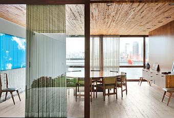 A wooden partition separates the dining room from the living room. The jacaranda table is a vintage find designed by Jorge Zalszupin for L’Atelier. The dining chairs are by the Brazilian designer Sergio Rodrigues and architect Isay Weinfeld designed the sideboard. The fluorescent lamp sculpture on the wall is Luz Natural by Eduardo Coimbra.