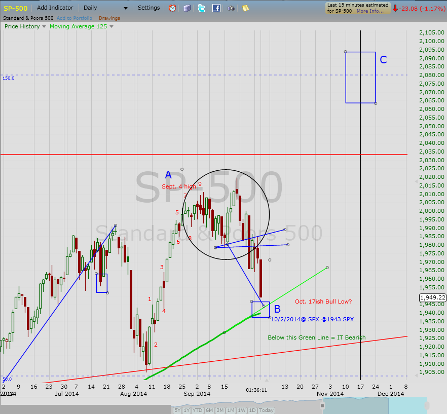 We are also testing the Green Support line on the long term SPY chart. Closing below this line would be a data point in favor of the September wave up being the terminal wave. There are a couple days left in the week to fix this off the 1943 support area, so I will wait to see how the week shakes out before pondering a break.
