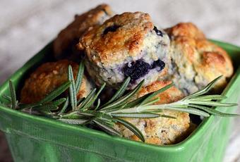In a large bowl, sift together flour, baking powder, and salt. Using your fingers, rub in butter until the mixture resembles small peas. Add in the sugar, chopped rosemary, and blueberries.