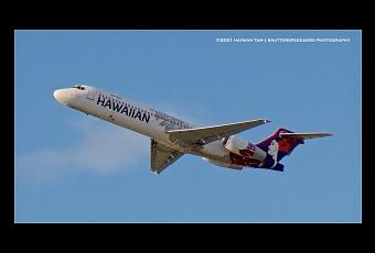 This 717 climbs out after takeoff, headed to one of the neighbor islands. Hawaiian 717s and 767s are named after birds, in this case Po’ouli (a forest bird). Hawaiian operates 18 of these aircraft, servicing interisland travel. The Boeing 717 airliner was designed and originally marketed by McDonnell Douglas as the MD-95, a derivative of the DC-9 family, prior to their 1997 merger. Fuji X-Pro2 w/18-135mm.
