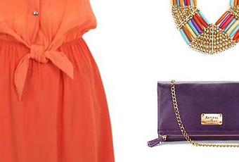 The great thing about current trends is that you can literally smash a dozen colors together and be ready to roll. I think a great starting point is a piece of statement jewelry with 3-5 colors in it. Use it as your guide to piece together the rest of your outfit. Today’s Inspiration: Miss Selfridge Coral Tie Dress ($61.00), Almost Edgy Stud Earrings ($10.00), Bib of Many Colors ($27.00), Aspinal of London Clutch ($175.00), Asos Franki Flat ($44.76).