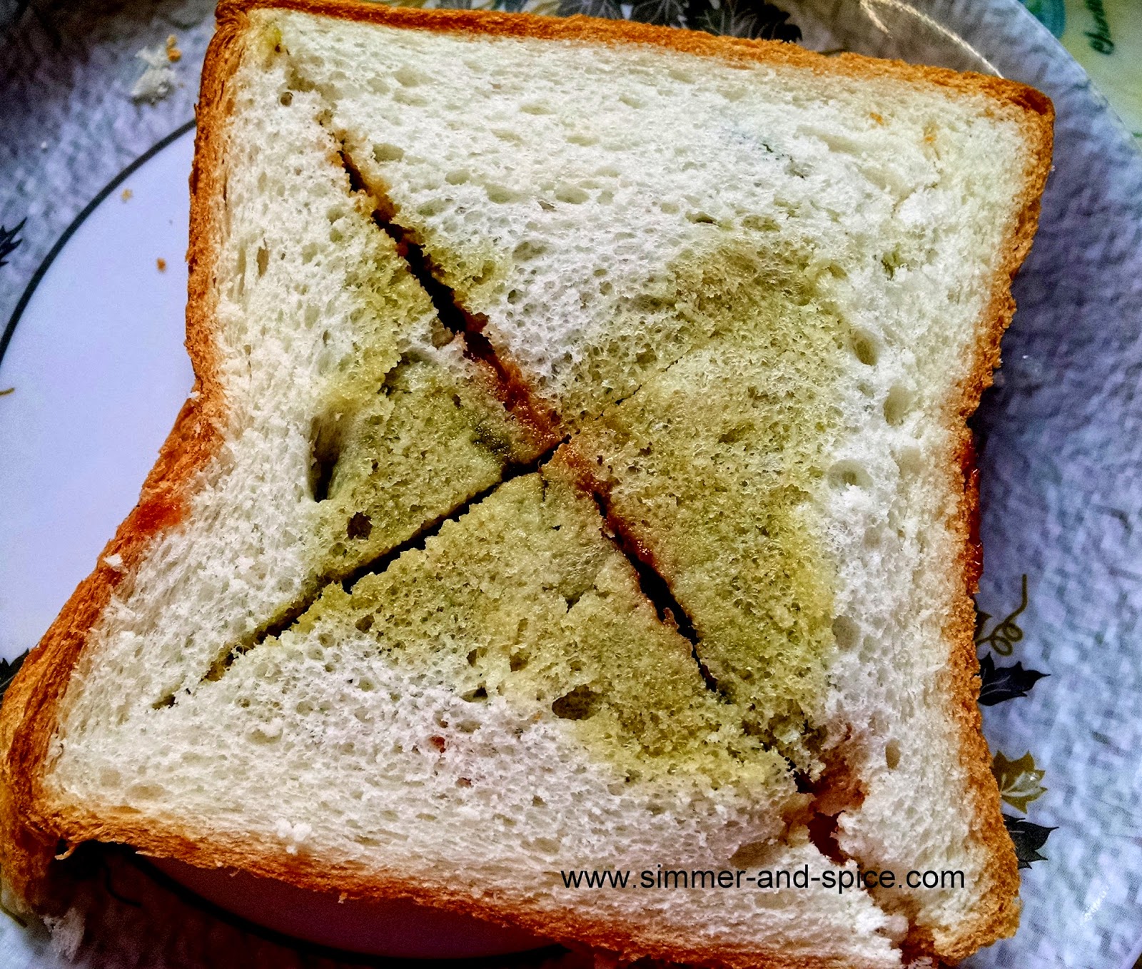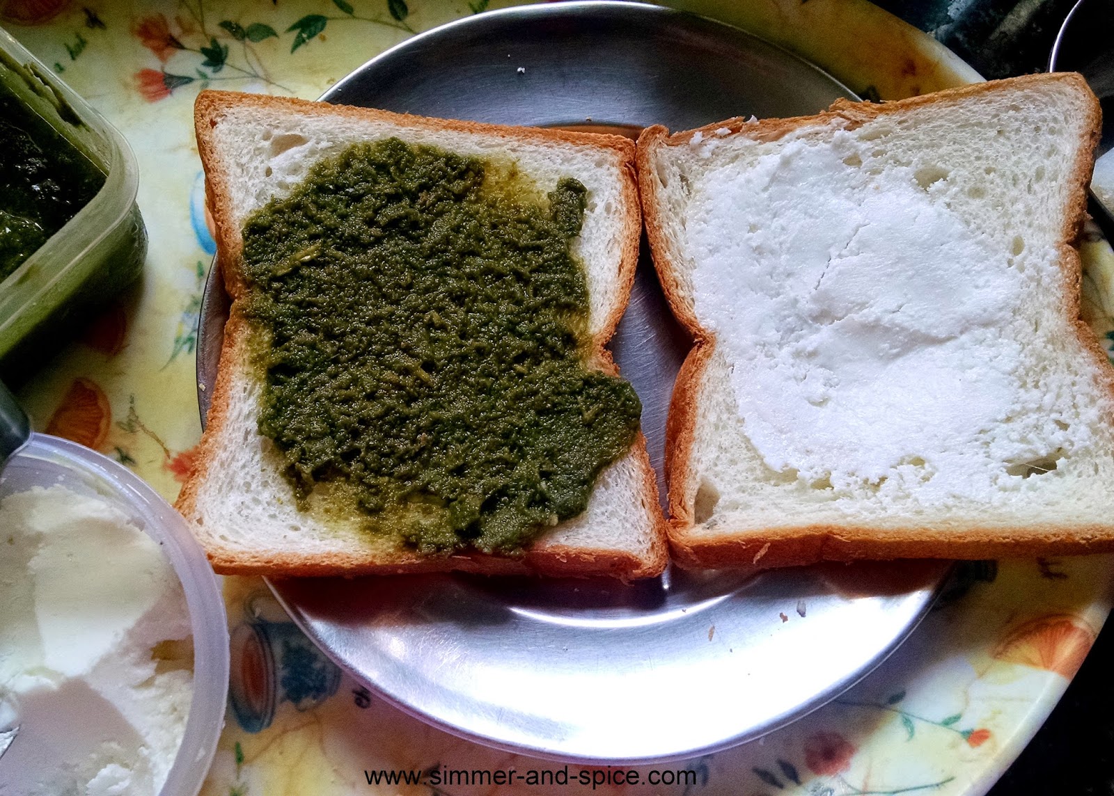 - Spread a tablespoon of green chutney onto each of the four of the bread slices and butter on the other four slices.