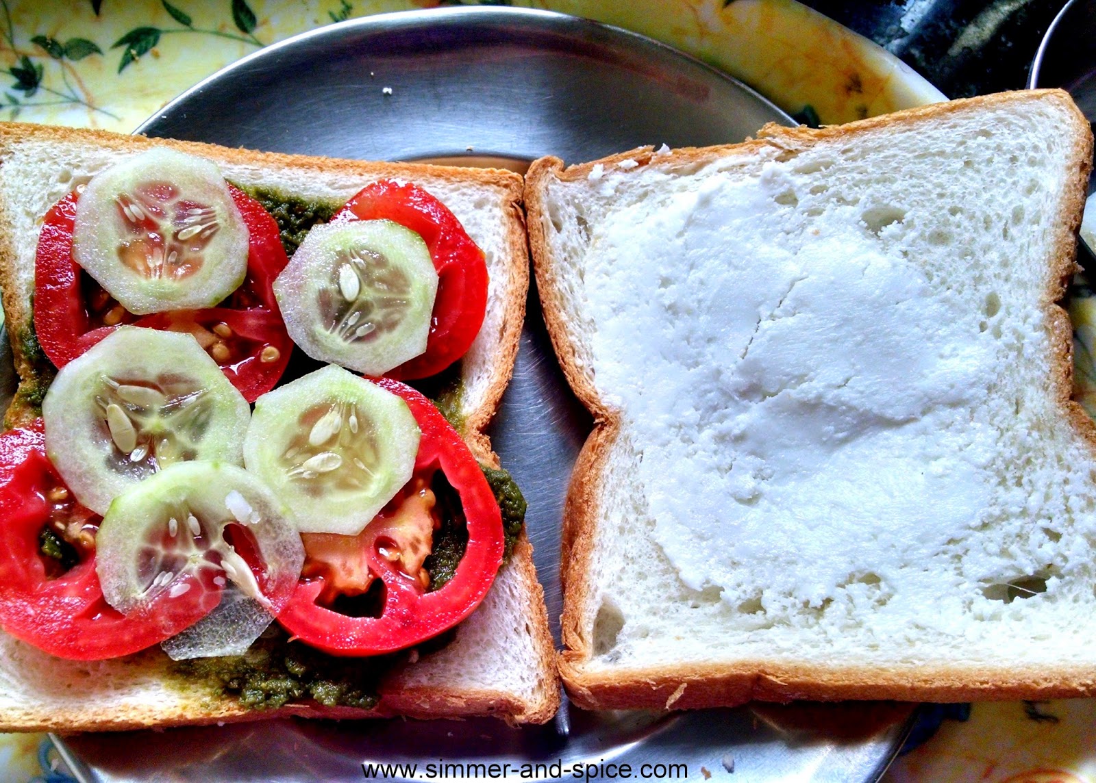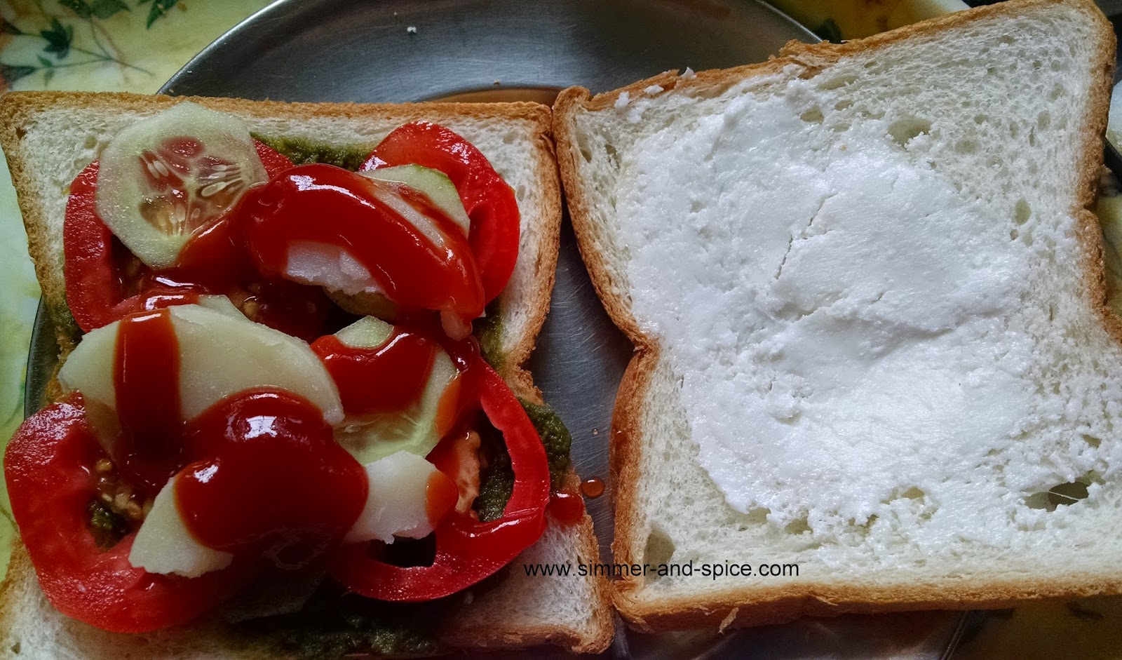 Ingredients :- 1. Green Chutney / Coriander Chutney (here is the recipe for it Corainder Chutney) 2.Butter ( I've used white butter which my mom made at home ) 3. Boiled potato cut in thin slices 4.Tomato cut in thin slices 5.Cucumber cut in thin slices 6.(optional) Onion cut in thin slices 7.Tomato Ketchup 8.Bread Slices