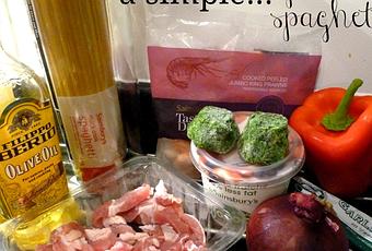 This is a really easy pasta/spaghetti recipe that is a huge hit whenever I cook it - prawns, bacon and vegetables in a creamy sauce. It looks and tastes like it took a huge amount of effort, when really this is one of the simplest things to cook. You will need...1 pack king prawns1 pack diced bacon (approx 3 rashers)1 onionFrozen (or fresh) spinach1 pepperCrème fraiche Garlic (fresh or puree)Vegetable stock cubeServes 2 hungry people, or three less hungry people!I try and look out for frozen king prawns when they're on offer in Sainsburys - which actually seems to be most of the time! I sometimes use a pack of diced bacon (if I have it), or alternatively just a few rashers chopped up. You can use as much or as little as you want.
