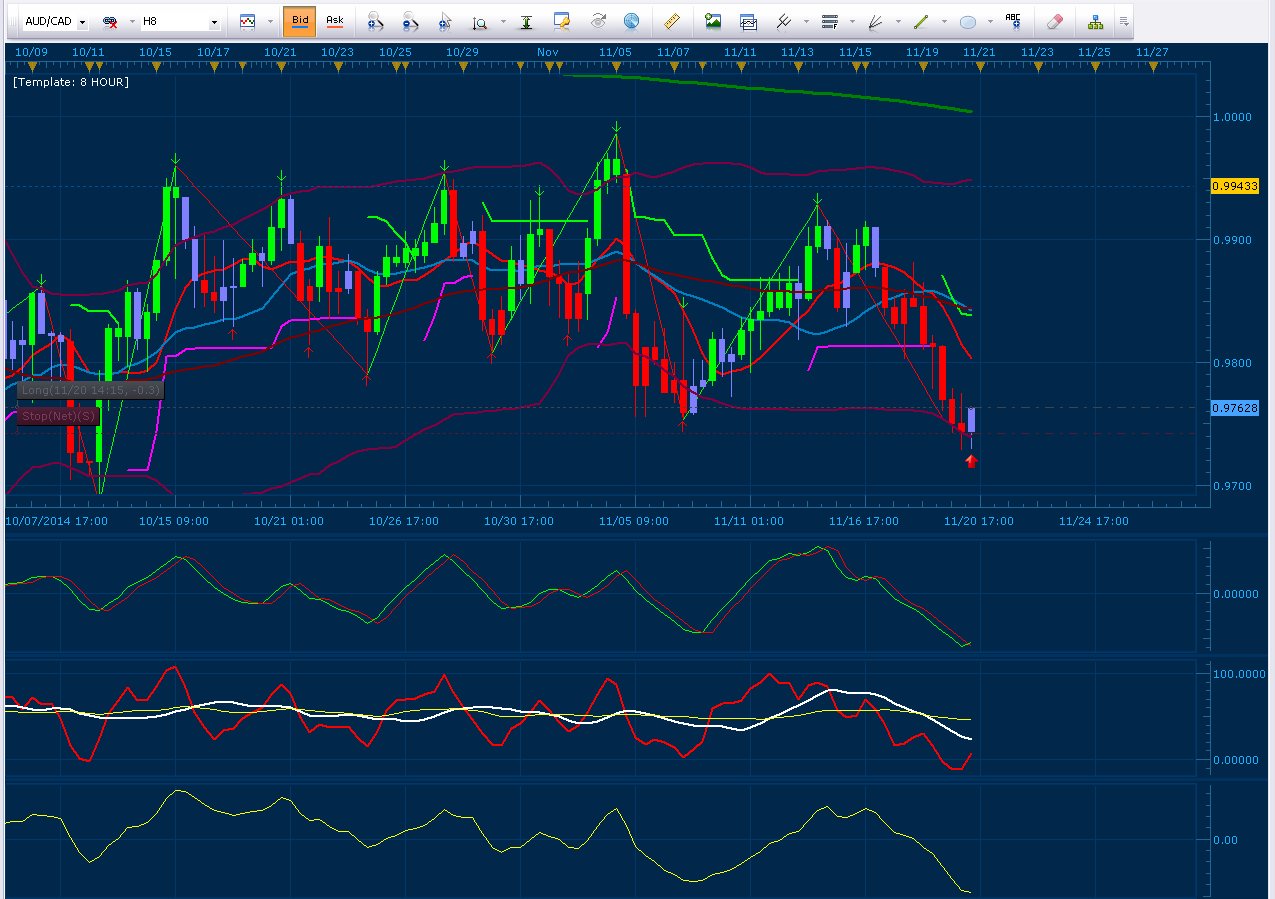 I am bullish AUDCAD off the 8 hour chart with a tightish stops. Momentum indicators and lower band area supports the play. All trades can fail. Chart: