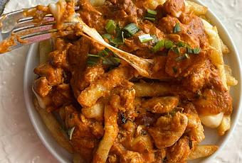 What you have here is a delicious mish mash of two cultures. Canadian poutine which is a dish composed of hot gravy cheese curds and fries. Indian Butter Chicken.