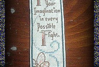 Another bookmark for the collection. This one turned out really well using nothing but scraps from other projects. I used some leftover light-blue aida cloth and some various blue and pink-orange threads. The quote is from Jane Austen, “Indulge your imagination in every possible flight”. This was a gift for my cooperating teacher after my month long student teaching. I might have to make this bookmark again, as much as I love butterflies I’m a little surprised I haven’t tried this one before.