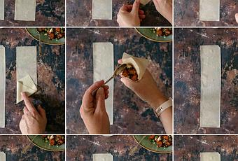 - Place the pastry back on the table, add flour paste to the edges and continue to fold up and seal. Repeat with the remaining leaves and filling.