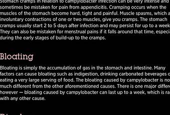 Bloating is simply the accumulation of gas in the stomach and intestine. Many factors can cause bloating such as indigestion, drinking carbonated beverages or eating a very large serving of food. The bloating caused by campylobacter is not much different from the other aforementioned causes. There is one major difference, however — bloating caused by campylobacter can last up to a week, which is rare with any other cause.