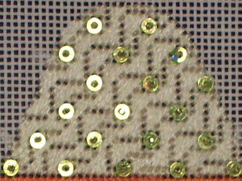 The chartreuse green Holographic sequins come out to play once again, this time accenting the Horizontal Milanese stitch on the top band: