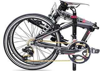 If you commute regularly on a bicycle you can now have your bread buttered on both sides. The UtlraX from Allen Sports is a ultra-light and compact carbon fiber performance folding bike. And it weighs a mere 18.75 pounds. The stiff and sturdy frame has a patented folding mechanism and headset to quickly open and close for easy transport and storage. The SRam X9 20 speed drivetrain provides a wide gear range designed for high speeds on flat terrain, climbing hills and everything in between.