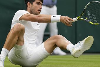 LONDON (AP) — There Carlos Alcaraz was, down on his backside at a baseline below the Royal Box, briefly taking a seat in the grass after doing the splits when he slipped while running to hit a forehand during his fourth-round match Sunday.