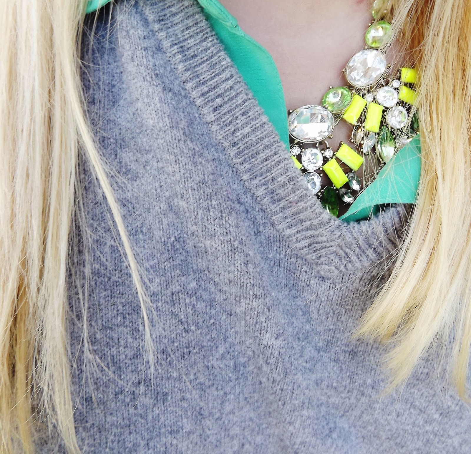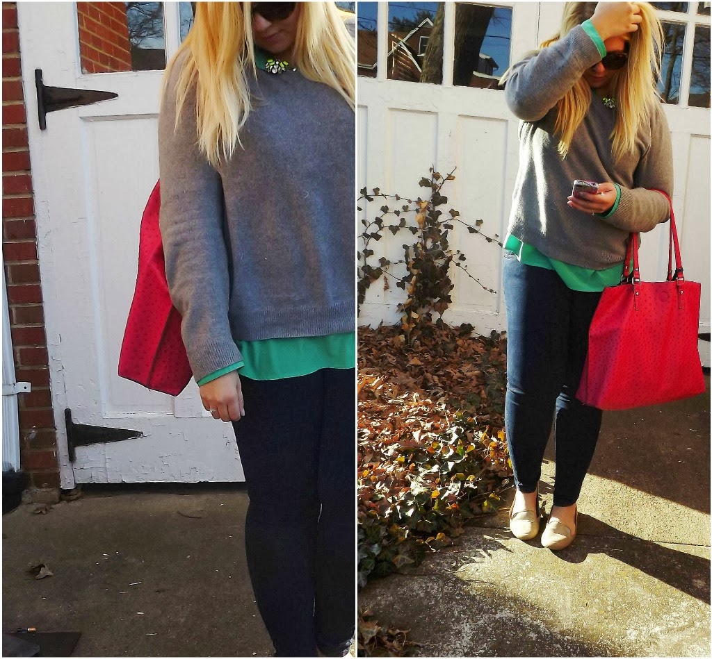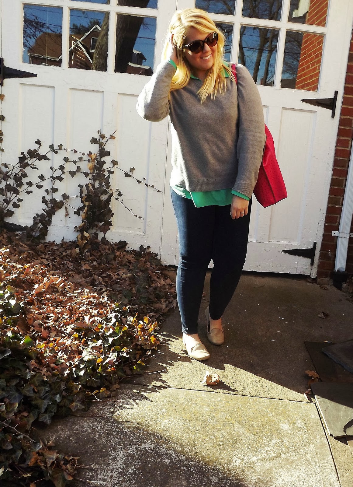 Outfit: Sweater- J.Crew, Blouse- Old Navy, Jeans- Old Navy, Loafers- Old Navy, Purse- Target, Necklace- J.Crew, Sunnies- Betsey JohnsonIt's no secret that by this time in the school year, we are all absolutely burnt out. If you can't tell by my somewhat flustered appearance, I am in the same boat. Burnt out, done, and ready to go kaput. Layers are what have kept me sane the last week or two when going to class. Really, they can make any rough day just a tad bit better. The teal underneath the gray adds a pop to the drab color. One thing I've learned is to always make the dark pop whether its with a color layered under or over or a piece of jewelry. It's far too dull to leave the dark color by itself. Besides I needed something bright to get me through the week! With me starting to TRY to give up the yummy starbucks sweet drinks, I need a new fix. I'm trying the SKINNY versions of the drinks. Not as sweet, but not half bad! It's Thursday thought which means the weekend AND Spring Break are right around the corner for me and plenty of other college students around the country! xoBCC