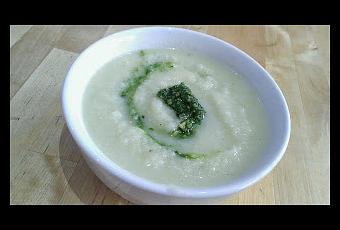 5) Pass the pureed cauliflower, celeriac and onion through a sieve and back into the stock, then stir through until the soup has been incorporated. Serve with the pistou.